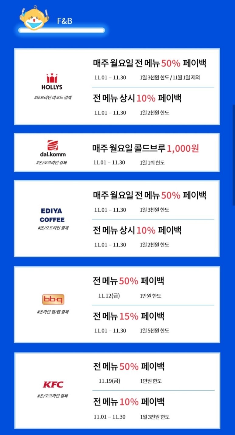 이번 11월은 이디야 bbq, kfc까지 페이백이 되니 굿굿.